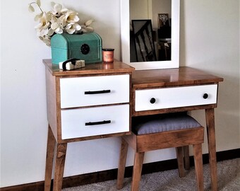 Mid century modern vanity cherry wood with natural finish version 3 piece set includes vanity, mirror and seat thank you for visiting my etsy shop and listings.